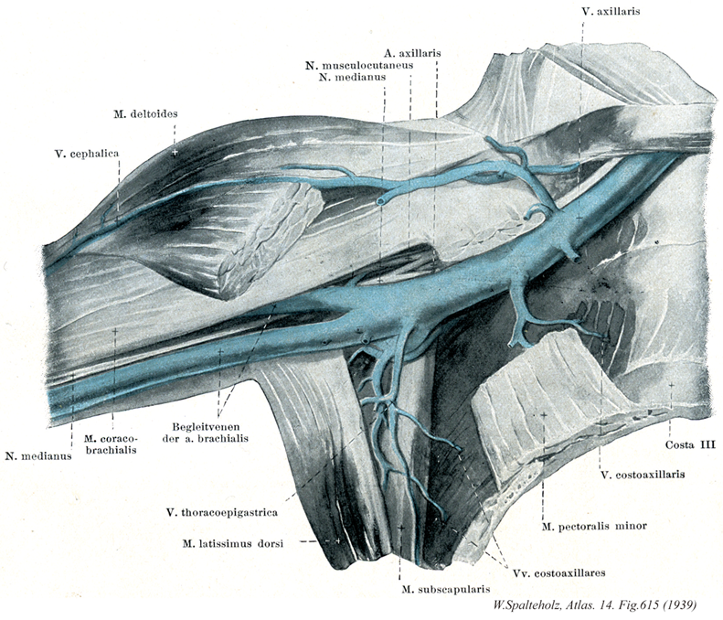 - 615_05【Cephalic vein橈側皮静脈 Vena cephalica】 Epifascial vein arising at the root of the thumb. It courses in the lateral bicipital groove and passes between the deltoid and pectoralis major (deltopectoral triangle; Mohrenheim's fossa) to the axillary vein.