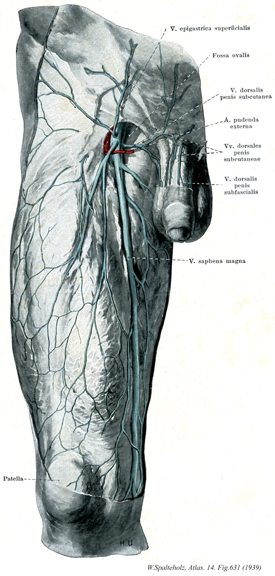 631_07【Great saphenous vein; Long saphenous vein大伏在静脈 Vena saphena magna】 Vein possessing valves that arises on the medial side of the foot and ascends medially, collecting most of the medial superficial cutaneous veins. It passes through the saphenous opening to empty into the femoral vein. →(大伏在静脈は古くは薔薇静脈とよんだこともある。ギリシャ語のsaphisは「見える」という意味であるというが、他方アラビア語では「かくれた」という意味を表すという。このように語原的にはギリシャ語とアラビア語では反対の意味に解されているのは興味深いが、いずれにしてもVena saphenaの語原ははっきりしていない。大伏在静脈は下肢最大の皮静脈で、下肢の内側に沿って皮下組織の中を上行する。足背の内側縁にはじまり、内果の前を通るが、この部分で皮膚のうえからその走行をみることができる。伏在神経と伴行して下腿の内側を通り、膝関節の後内側を経て大腿内側面を上行し、鼡径靱帯の下方で深く入り、伏在裂孔で大腿静脈にそそぐ。この経過の途中、周辺より多くの皮静脈がこれに合流するが、とくに大腿の内側と後面よりの皮静脈は1本に合して伏在裂孔のやや下方で大伏在静脈にそそぐことがある。これを副伏在静脈という。また大腿の前面や外側面よりの皮静脈が合しこれにそそぐときは、とくに外側伏在静脈とよぶことがある。このときは大内々側面よりのものは内側伏在静脈という。)
