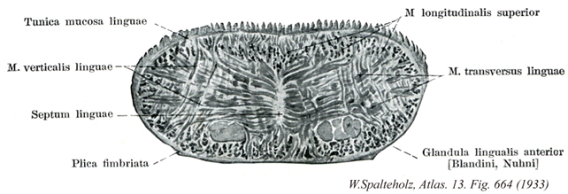 - 664_03【Lingual septum舌中隔 Septum lingualis】 Connective-tissue partition located in the midsagittal plane that partly divides the tongue and gives origin to muscle fibers.
