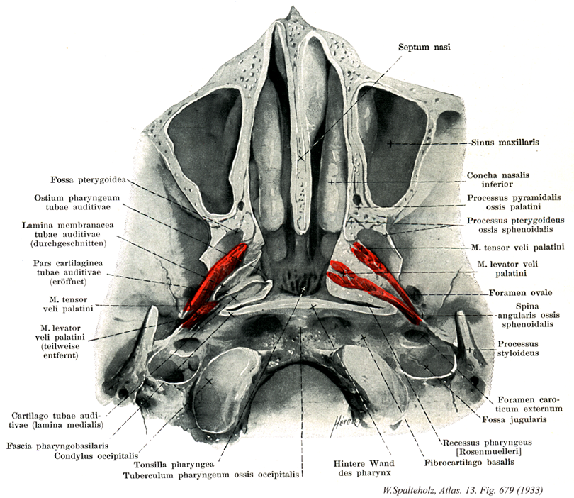 →(口蓋帆張筋は舟状窩、蝶形骨大翼下面の細い帯および耳管の膜性外壁から起始する。翼突窩のレベルで口蓋帆張筋はすでに腱に移行し、腱は翼突鈎をめぐって方向を転じて、水平に口蓋腱膜へ放射する。口蓋帆張筋は燕下swallowing or deglutionの時に耳管を開く作用がある。)