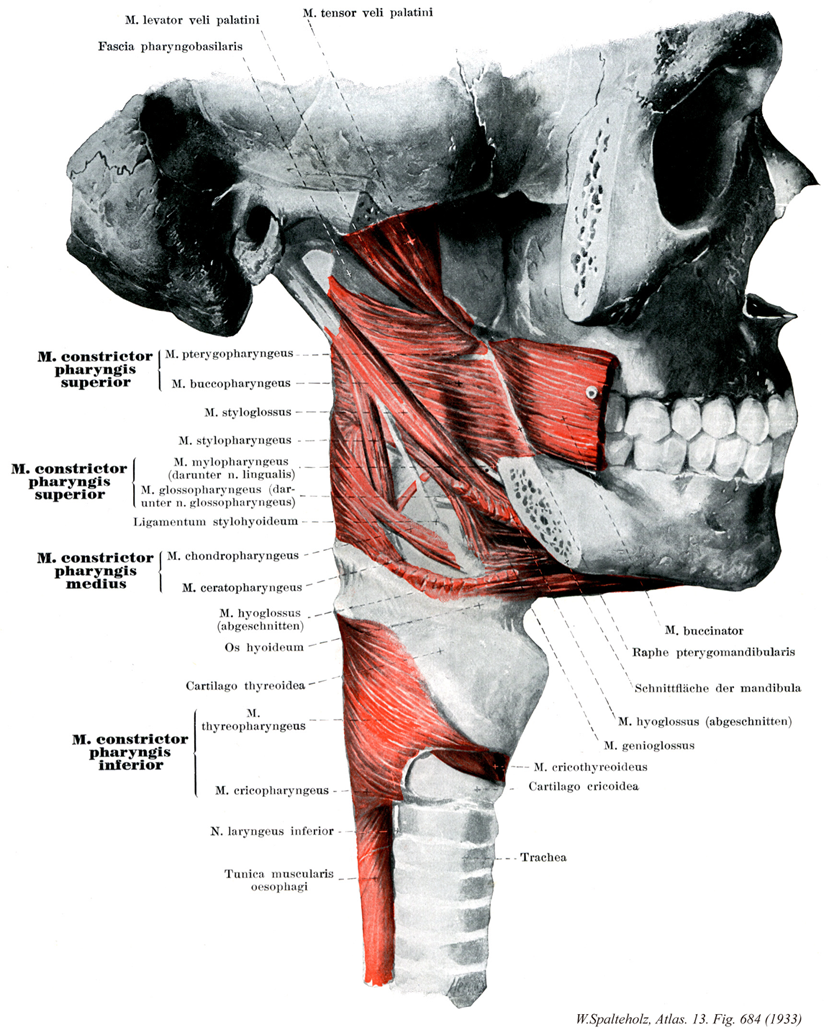 →(上咽頭収縮筋には正中の方へわずかに上行する線維束があり、その起始する部位によってさらに細かく区分される(翼突咽頭部、頬咽頭部、顎咽頭部、舌咽頭部)。)