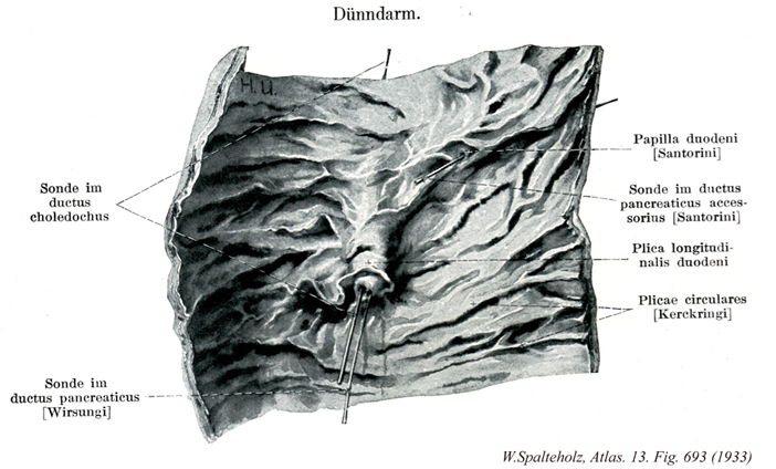 →(十二指腸は胃の幽門から十二指腸空腸曲まで約25cmの腸管。十二指腸Duodenumは12で、intestinum duodenum digitorumの意味。長さが指を12本横にならべた幅に等しいことによる。第1腰椎の椎体右縁の前方ではじまり、C字状に屈曲して膵臓の頭を取り囲む。腸間膜を欠き、後腹膜臓器の一つであり、胆管、膵管が開口するなど他の小腸とは異なる。十二指腸には4部が区別される。上部は幽門につづく5cmの長さの部で、上背外側へはしる。最初の2.5cmは可動性。上縁には小綱が付着する。上十二指腸曲において、ほぼ下方へ屈曲し、下行部(約8cm)へ移行する。その半ばで後内側壁に一条の十二指腸ヒダがり、その下端に大十二指腸乳頭が隆起し、ここに総胆管と膵管が共通に開口する。その上方2~3cmの部に小十二指腸乳頭があることが多く、副膵管の開口をみる。下行部は下十二指腸曲で左方へ屈曲し、水平部(下部、約8cm)へ移行し、第3腰椎体左縁に達し、左上方へ屈曲し、上行部へつづく。この部は約5cm走行したのち、第2腰椎の左方で急に前方に曲がり空腸へ移行する。この部を十二指腸空腸曲という。この曲がりは、横隔膜直下の後大動脈壁から下降する十二指腸提筋で固定されている。十二指腸の前半、ほぼ大小十二指腸乳頭までには、よく発達した十二指腸腺がある。複合管状胞状腺で、分泌物は粘液性でアルカリ性を示すことから胃酸から粘膜を保護するのではないかといわれる。)