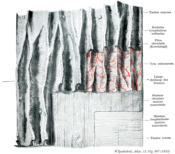 - 697_03Kerckring's valves【Circular folds of small intestine; Circular folds of Kerckring; Kerckring's valves輪状ヒダ;ケルクリング襞(小腸の) Plicae circulares intestini tenuis】 Up to 8 mm high permanent folds containing submucosa that extend transversely to the intestinal axis, encircling around two-thirds of the intestinal lumen.