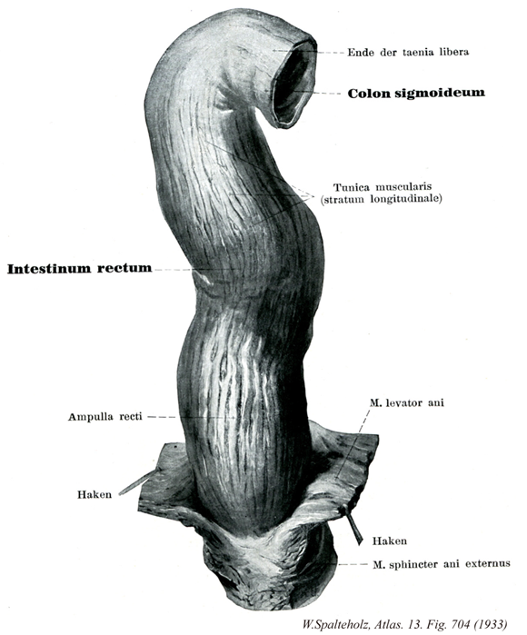 704_01【Rectum直腸 Rectum; Intestinum rectum】 Tenia-free 15 cm long segment extending between the sigmoid colon and anus. →(直腸は消化管の末端部でS状結腸につづく大腸の一部である。結腸から直腸への移行はゆるやかで、仙骨中央部あたりがほぼ両者の境界となる。直腸は腸間膜を欠き、直腸ヒモを示さない部分である。直腸の下端は、骨盤隔膜を貫く寸前までで、それ以下は肛門管である。肛門管の直上部にあたる直腸窩部はふくらみ、ここを直腸膨大部という。膨大部上方には横走するヒダが2~3本認められ、直腸横ヒダといい、最も恒常的なものは右壁にあって、コールラウシュのヒダという。直腸ははじめ仙骨の曲がりに沿って前方に凹の間借りを示し、これを仙骨曲といい、下端近くでは前方に凸の曲がりを示し、これを会陰曲という。直腸壁の平滑筋の筋層のうち、重筋層と一部の輪筋層は周辺の臓器へとのび、直腸尾骨筋、直腸膀胱筋、直腸尿道筋などとよばれる筋束をなす。直腸が内容をいれて拡張すると、壁の伸展刺激は求心性神経線維によって仙髄に伝えられ、反射的に内容の排出、すなわち排便が起こる。このような排便中枢の中枢は仙髄(S2~4)にあり、肛門脊髄中枢anospinal centerといわれる。排便defecationのさいには、交感神経が抑制されるとともに、副交感神経の興奮が高まって、大腸の蠕動・収縮がおこり、内肛門括約筋は弛緩し、さらに陰部神経を介して外肛門括約筋も随意的に緩められる。そのほかに、腹壁の筋・横隔膜・骨盤隔膜を作る肛門挙筋の収縮によって腹圧が高められ排便を助ける。)