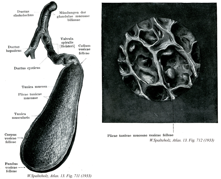 712_00【Gallbladder胆嚢;タンノウ Vesica biliaris; Vesica fellea】 Pear-shaped organ measuring 8-12 cm in length. →(胆嚢はナスビの形のふくろ(長さ約9cm、太さ約4cm)で、胆汁を貯える。肝臓の下面の下面にあって、胆嚢窩に浅くはまりこんでいるので、肝臓の下面の被膜と共通の結合組織でおおわれ、下面と底は腹膜におおわれる。胆嚢の底はふくろの底の部分、体はふくらみの部分、頚は細くなった部分である。底が前方に向き、肝臓の下縁から少し前に突出している。頚がうしろ向き、胆嚢管につながる。胆嚢の内面には網状のひだが突出し、丈の高い単層円柱上皮でおおわれる。上皮細胞は粘液分泌を行う。よく発達した筋層がある。胆嚢管は長さ約3cmのやや迂曲する管で、内腔にらせん状に突出するひだがあり、らせんひだとよばれる。胆管と合流して総胆管となる。肝管を流れてくる胆汁は、通常、胆嚢管にはいって胆嚢に貯えられ、必要に応じて胆嚢管から総胆管を経て必要に応じて胆嚢管から総胆管を経て十二指腸に放出される。とくに食事が十二指腸に達すると、十二指腸壁から血中にコエシストキニンが放出され、このホルモンの左葉で胆嚢が収縮し、胆汁が排出される。)