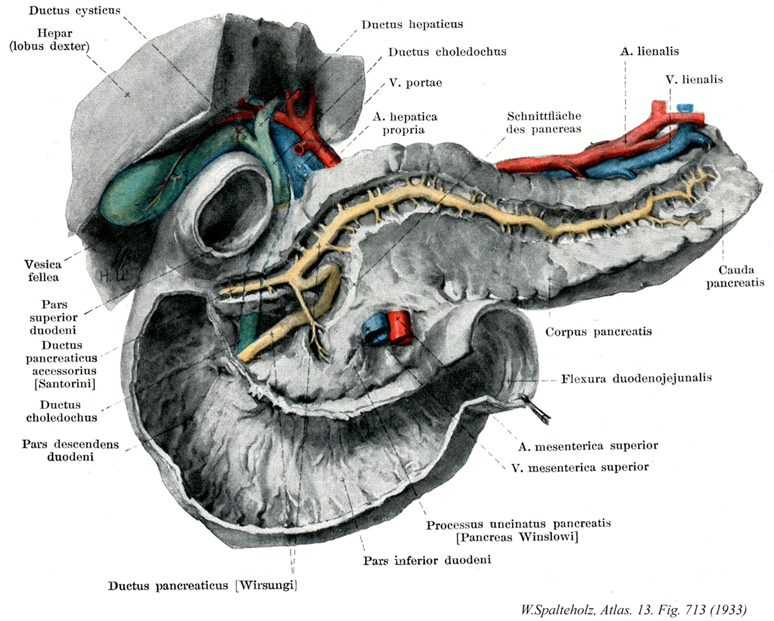 →(分布域は十二指腸遠位側の半分から左結腸曲に拡がる。脾静脈と一緒になって門脈をつくる。 (Feneis))