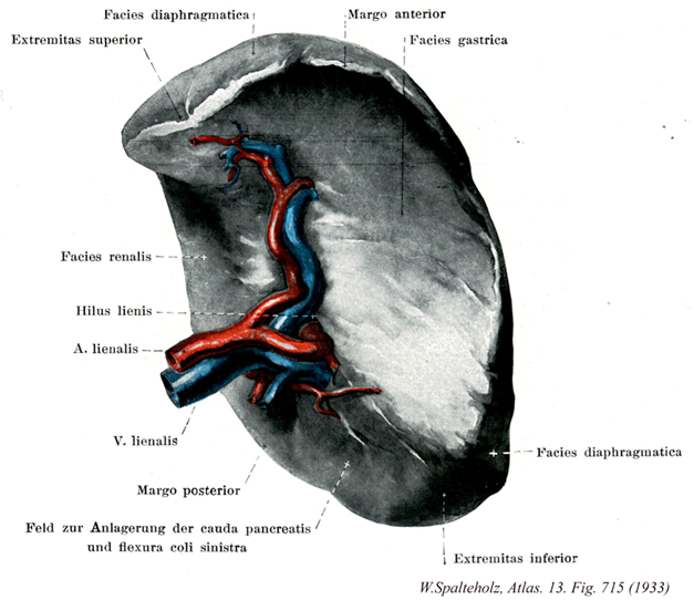 - 715_04【Splenic hilum; Hilus of spleen; Hilum of spleen脾門 Hilum splenicum; Hilum lienale】 Entry and exit site for vessels between the gastric and renal impressions.