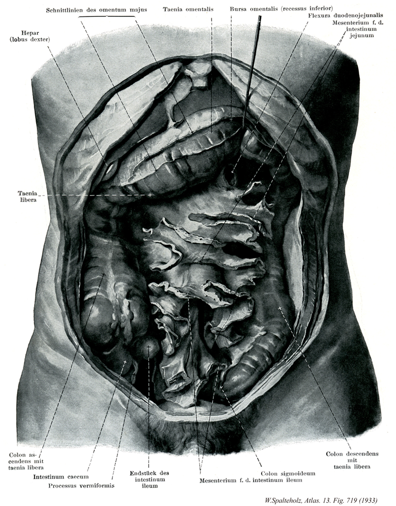→(大網は胃の大弯から広がっている腸管の表面にエプロンのように下垂している二重の腹膜葉。横行結腸および結腸間膜に癒合しているが自由に移動できる。横行結腸を越え、下腹部の小腸の迂曲部の前まで広がることがよくある。他の例では腹膜腔の陥凹部に強く引き込まれていることがある。大網のうち胃の大弯と横行結腸との間に広がる部分は胃結腸間膜と呼ばれる。胃に分布する大弯の血管弓が大網の付着部に存在する。大網は左方で脾臓の脾門に続き、この部分を胃脾間膜と呼ぶ。大網には脂肪と免疫系の細胞が多く、乳斑を形成している。大網は腹膜腔内の炎症による被包に巻き込まれることがよくあるが、その場合癒着したり、腹部臓器とともに大きくなったりする。)