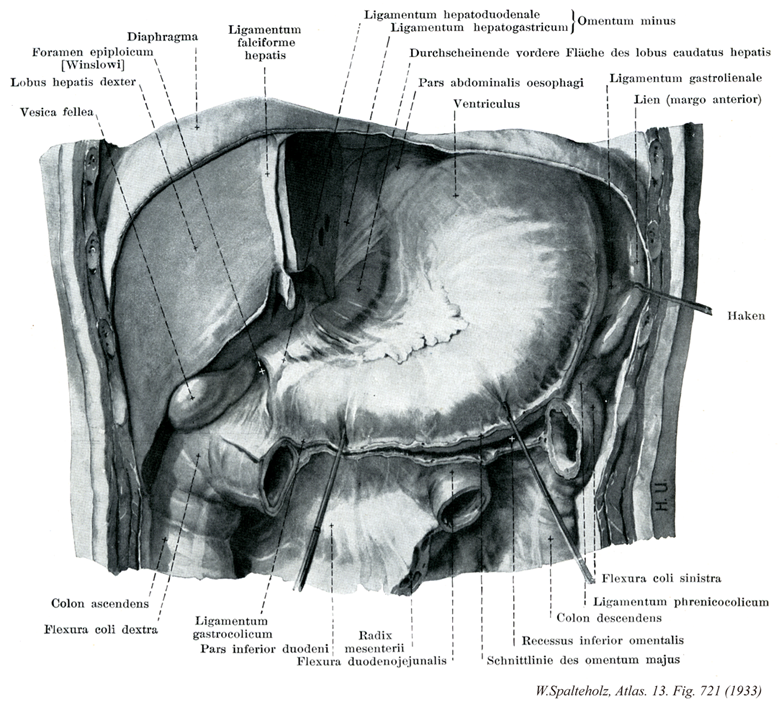 - 721_14【Hepatogastric ligament肝胃間膜;肝胃部(小網の) Ligamentum hepatogastricum; Pars hepatogastrica】 Part of the lesser omentum that passes between the liver and the lesser curvature of stomach.