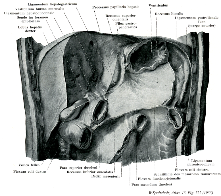 - 722_00【Omental bursa; Lesser sac; Lesser peritoneal sac網嚢;腹膜の小嚢 Bursa omentalis】 Largest pocket within the peritoneal cavity, located behind the stomach and lesser omentum.