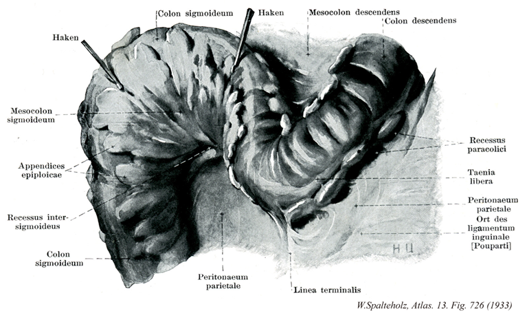 - 726_01【Sigmoid mesocolon; MesosigmoidS状結腸間膜 Mesocolon sigmoideum; Mesosigmoideum】 Peritoneal fold attached to the sigmoid colon.