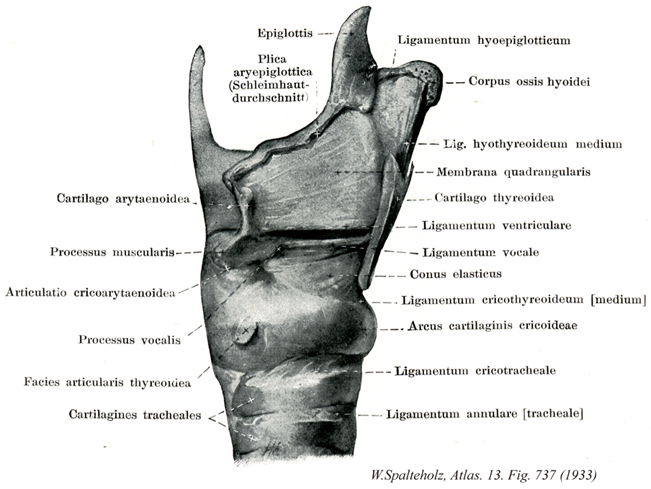 737_16【Conus elasticus; Cricovocal membrane弾性円錐;輪状声帯膜 Conus elasticus】 Thickened portion of the fibroelastic membrane between the vocal ligament and cricoid cartilage. →(声帯靱帯と輪状軟骨の間の強い弾性膜。 (Feneis))