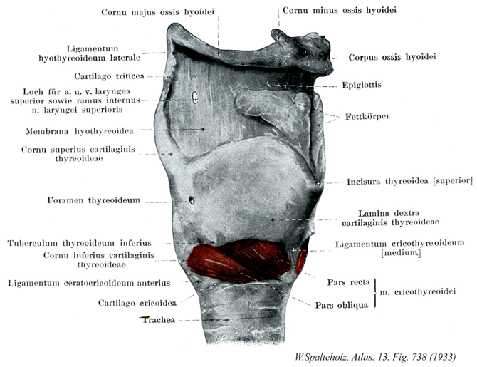738_25【Oblique part of cricothyroid斜部(輪状甲状筋の) Pars obliqua (Musculus cricothyroideus)】 Posterior fibers that run more horizontally. →(後側の、水平に走る筋線維。 (Feneis))