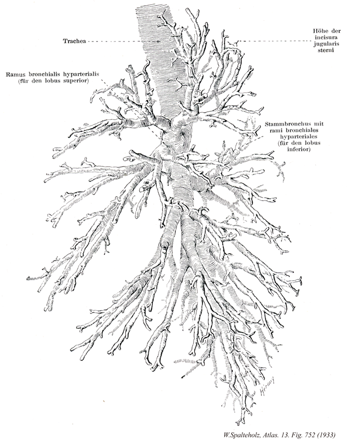 752_05【Right inferior lobar bronchus右下葉気管支 Bronchus lobaris inferior dexter; Stammbronchus】 It supplies the right inferior lobe, which extends posteriorly up to the level of the fourth rib. →(右下葉気管支は後は第四肋骨までの右下葉へ向かう葉気管支で上-下葉枝(B6)、内側肺底枝(B7)、前肺底枝(B8)、外側肺底枝(B9)、後肺底枝(B10)よりなる。)