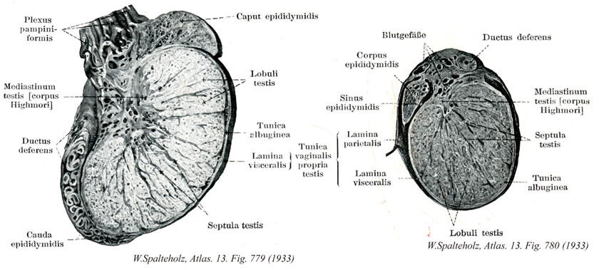 - 779_09【Visceral layer of tunica vaginalis testis臓側板(精巣鞘膜の);睾丸外膜 Lamina visceralis (Tunicae vaginalis testis); Epiorchium】 Layer lying on the tunica albuginea and epididymis. It does not cover the mediastinum of testis.