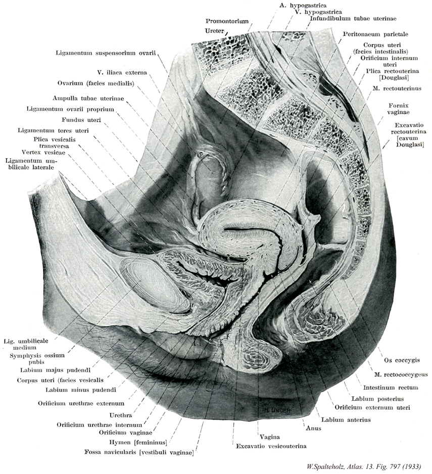 - 797_44【Vesicouterine pouch; Vesicouterine fossa♀膀胱子宮窩 Excavatio vesicouterina♀】 Recessed peritoneal pocket between the urinary bladder and uterus.