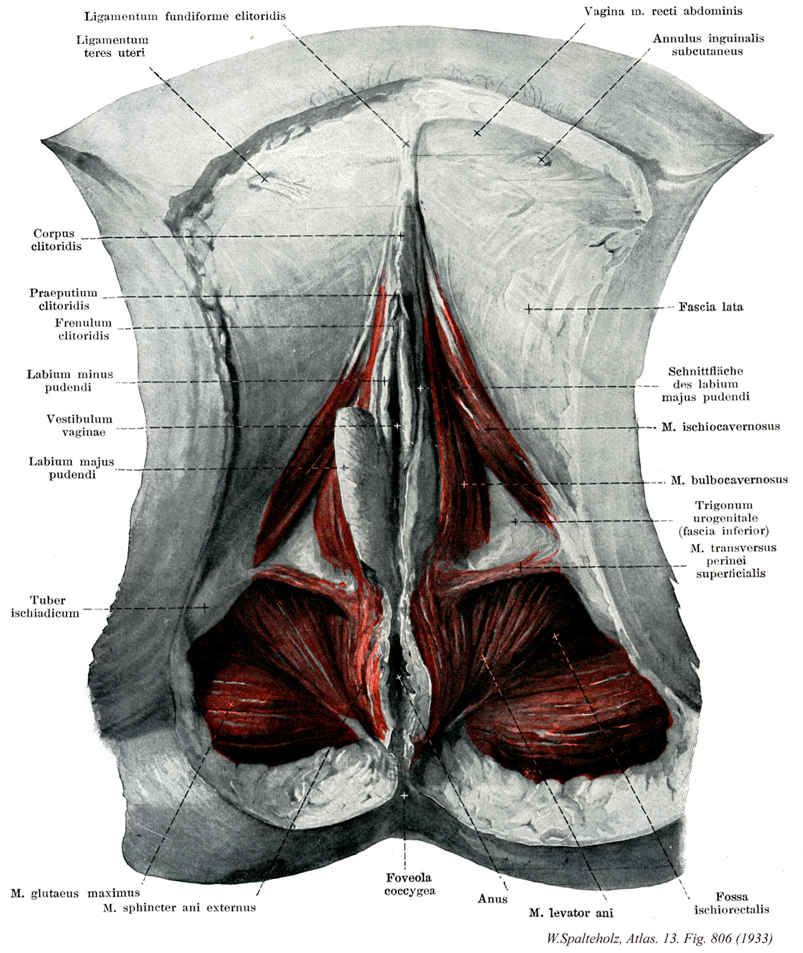 →(坐骨海綿体筋は男性より女性のほうが発達が弱い。この筋は坐骨枝より起こり陰核脚を被い、その腱性線維は外下表面に付く。その筋は陰核海綿体を圧し、血液を押し付け流出を妨げ、それにより陰核の勃起成立を助ける。)