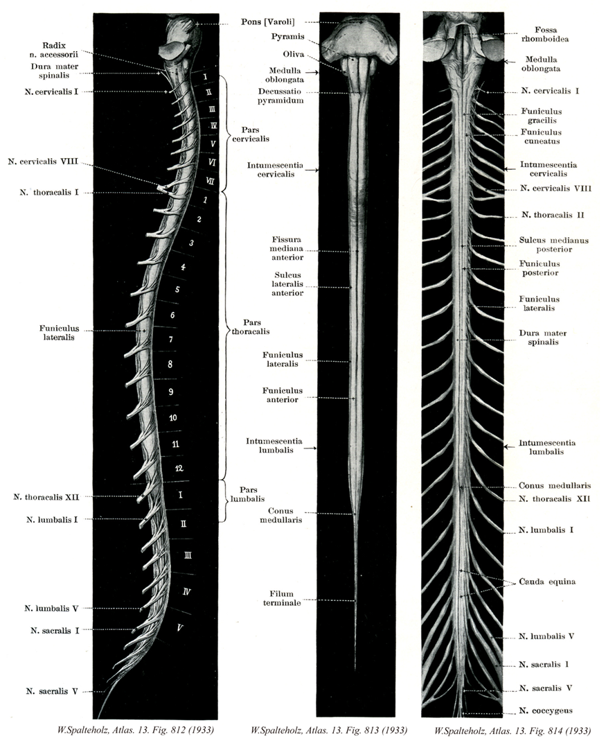 - 813_00【Spinal cord脊髄 Medulla spinalis】 It extends from the end of the medulla oblongata near the exit of the first spinal nerve to the beginning of the terminal filum at L1 or L2.