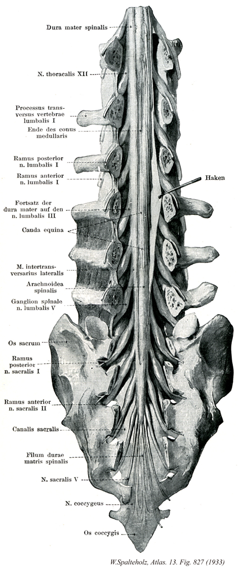 →(caudaは、「尾」を意味するラテン語であり、equinaは、「馬」を意味するラテン語equusの形容詞である。 第一または第二腰椎より下方へ向かう脊髄神経根線維のすべてで、終止の周囲をとりまいている腰仙骨神経根をひとまとめにして馬尾と呼ぶ。)