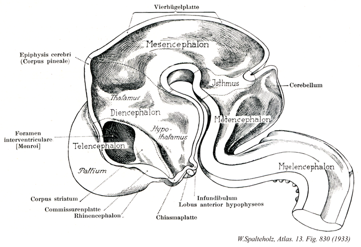 →(間脳は「間」を意味するギリシャ語の接頭詞diaと、「脳」を意味するencephalonを結合したもの。間脳は中脳の前方で第三脳室を取り囲んだ領域をいう。背側方は側脳室におおわれ、背外側は分界条によって尾状核と境され、外側を内方によって取り囲まれている。前方は室間孔まで伸び、後方は後交連と乳頭体の後方を結ぶ線で中脳被蓋に移行する。間脳はさらに背側視床、視床下部、腹側視床および視床上部に分かれる。背側視床はこれらのうちもっとも大きな部位を占め左右を視床間橋(中間質)によって結ばれる。背側視床と視床上部とを視床脳とよぶことがある。 間脳の発生development of the diencephalon:間脳は間脳胞から発生する。胎生第4週のおわりころにおける脳の原基は、前脳胞・中脳胞・菱脳胞の3脳胞が確立し、前脳胞ではその外側壁の前腹側部から外方に向かって大きい眼胞が膨出している。第5週に入ると(第14段階)、この眼胞の出発部の前背側にあたる部分の外側壁が前外方、ついで背外方に向かって膨出し、左右1対の半球胞を形成する。左右の半球胞を連ねる前脳胞の前背側端部を終脳正中部という。終脳正中部と半球胞とが終脳を形成し、これまでの前脳胞の大部分を占める領域は、これ以降、間脳胞と呼ばれる。 間脳胞ははじめ頭尾(前後)方向に長い管であり、その内腔は間脳室(後に第三脳室)とよばれる。陥凹胞においても、中脳以下の神経管の各部におけると同じく、実質的な神経細胞の形成は左右の外側壁においてのみおこり、背側壁(蓋板)と腹側壁(底板)においては著明な肥厚は見られない。蓋板は単層立方上皮となり、外側から間葉組織によって裏打ちされて、第三脳室脈絡組織となる。 肥厚・増大していく間脳の外側壁の内面には一過性に前後に走る3本の浅い溝(背側から腹側へ1.間脳背側溝、2.間脳中間溝、3.間脳腹側溝)がみとめられ、これによって外側壁は1.視床上部、2.背側視床、3.腹側視床、4.視床下部の4部に区画される。その後の発育において背側視床と腹側視床がとくに高度に発育し、両者が合一して強大な視床を形成する。胚芽層から生じた多数の神経[芽]細胞は外套層および縁帯の各所に集合して前核・内側核・中心核・腹側核・外側核・視床枕核などの視床核を形成する。 視床上部はヒトでははなはだ退化的で、これに属する構造物としては、間脳の後端部における松果体、手綱および手綱三角のみである。松果体は胎生第7週において間脳の蓋板の後端正中部から背後方に向かって生ずる1個の中空の膨出として発生する。 視床下部は間脳の外側壁および腹側壁を埋め、およそ8個に大別される神経核を形成する。 間脳胞の内腔である間脳室は、はじめは円形に近い横断面を示すが、外側壁の発育につれて上下方向に広く左右方向に狭い空間となり、ついには正中矢状断面に一致した左右の幅の非常に狭い裂隙状の腔となる。この間脳室とその前端につづくごく狭い終脳正中部の内腔を合わせて第三脳室という。)
