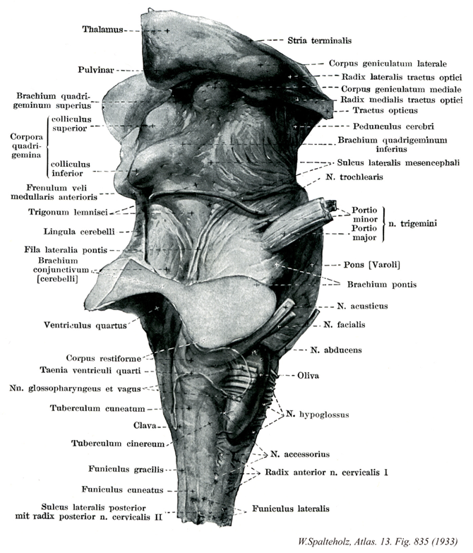 - 835_32【Lateral groove of midbrain中脳外側溝 Sulcus lateralis mesencephali】 Furrow between a cerebral crus and the tegmentum