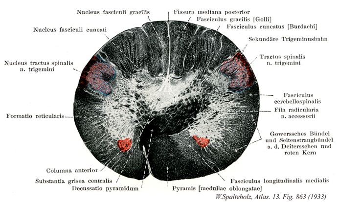 - 863_10Burdach's tract【Cuneate fasciculus楔状束;外側部;ブルダッハ索(後索の) Fasciculus cuneatus; Pars lateralis funiculus posterior】 Lateral portion of the posterior funiculus. It lies lateral to the posterior intermediate sulcus and contains fibers of tactile sensation and deep sensibility. It begins at the upper half of the body (T4-C1).