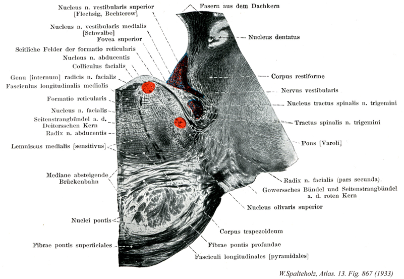 - 867_02【Medial vestibular nucleus in pontile tegmentum前庭神経内側核;前庭神経三角核(橋被蓋の) Nucleus vestibularis medialis; Nucleus terminalis triangularis nervus vestibuli; Nucleus angularis (Bechterew)】 (Schwalbe's nucleus) Middle vestibular nucleus.