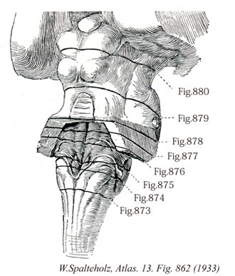 →(三叉神経脊髄路核は三叉神経脊髄路の内側にそってあり、橋の三叉神経根のレベルから第二頚髄まで存在する。三叉神経脊髄路の線維は全域にわたってこの神経核の細胞に終止する。細胞構築上三叉神経脊髄核は①吻側部、②中間部、尾側部に分けられる。)