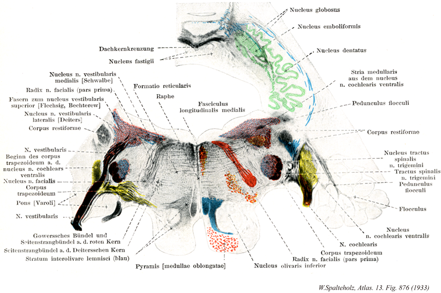 - 876_09Bechterew, Nucleus of【Superior vestibular nucleus前庭神経上核;上前庭神経核;前庭神経背側核;ベヒテレフ核 Nucleus vestibularis superior; Nucleus terminalis dorsalis nervus vestibuli; Nucleus angularis (Bechterew)】 Nucleus situated above the lateral vestibular nucleus that receives afferents from the ampullary crests. It has projections to the medial longitudinal fasciculus and cerebellum.