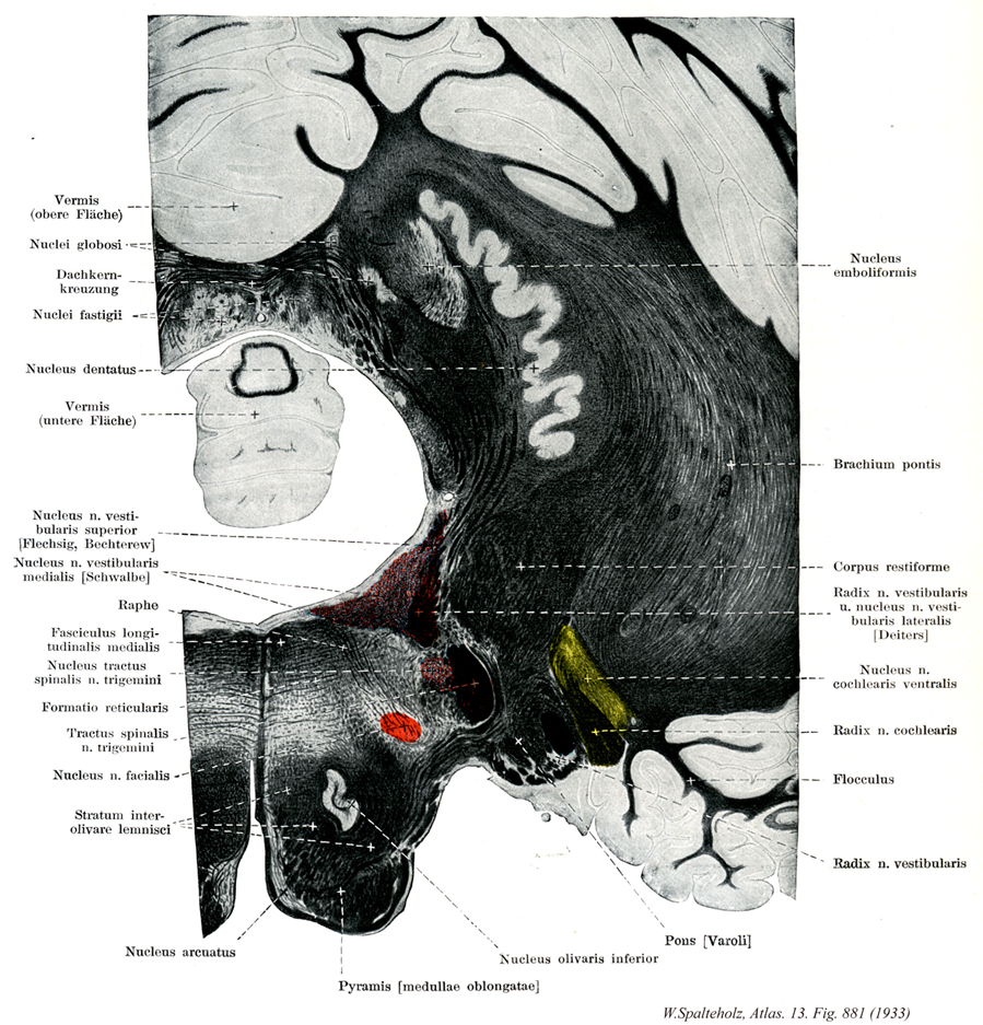 - 881_06Bechterew, Nucleus of【Superior vestibular nucleus前庭神経上核;上前庭神経核;前庭神経背側核;ベヒテレフ核 Nucleus vestibularis superior; Nucleus terminalis dorsalis nervus vestibuli; Nucleus angularis (Bechterew)】 Nucleus situated above the lateral vestibular nucleus that receives afferents from the ampullary crests. It has projections to the medial longitudinal fasciculus and cerebellum.