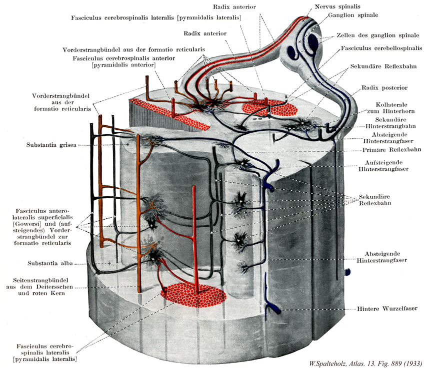 →(白質は主として縦走する有髄線維からなり、灰白質の外方に脊髄索、すなわち前索、後索および側索をつくる。後索は下等動物では発育が悪いが、高等動物、ことにヒトではよく発達し、左右の後索は後正中溝およびそれに続いて正中面にある薄い隔板(後正中中隔)によって分離される。白質には脊髄と脳を結ぶ投射神経路と脊髄の各部を結ぶ連合神経路がある。前者には上行性(知覚性)のものと下行性(運動性)のものがある。)