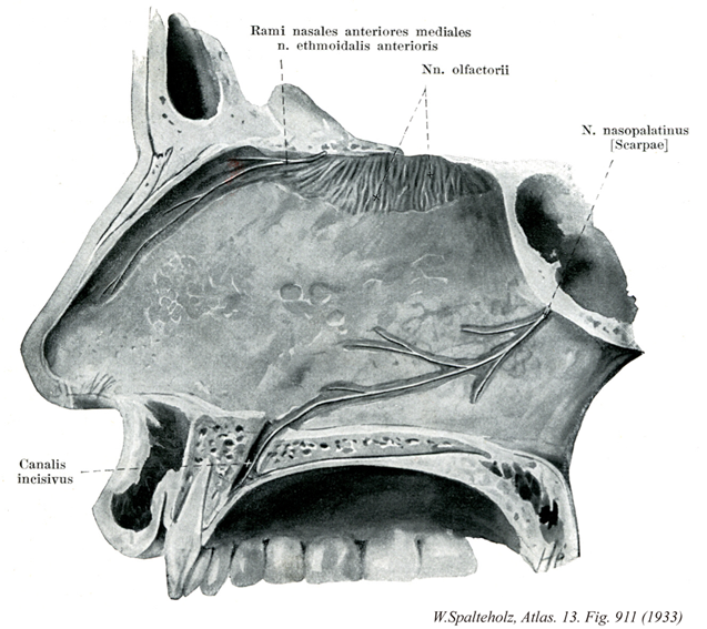 - 911_04Scarpa's nerve【Nasopalatine nerve鼻口蓋神経 Nervus nasopalatinus】 Nerve passing between the periosteum and mucosa of the nasal septum, then through the incisive canal to the anterior portion of the palatine mucosa and gingiva of the upper incisor teeth.