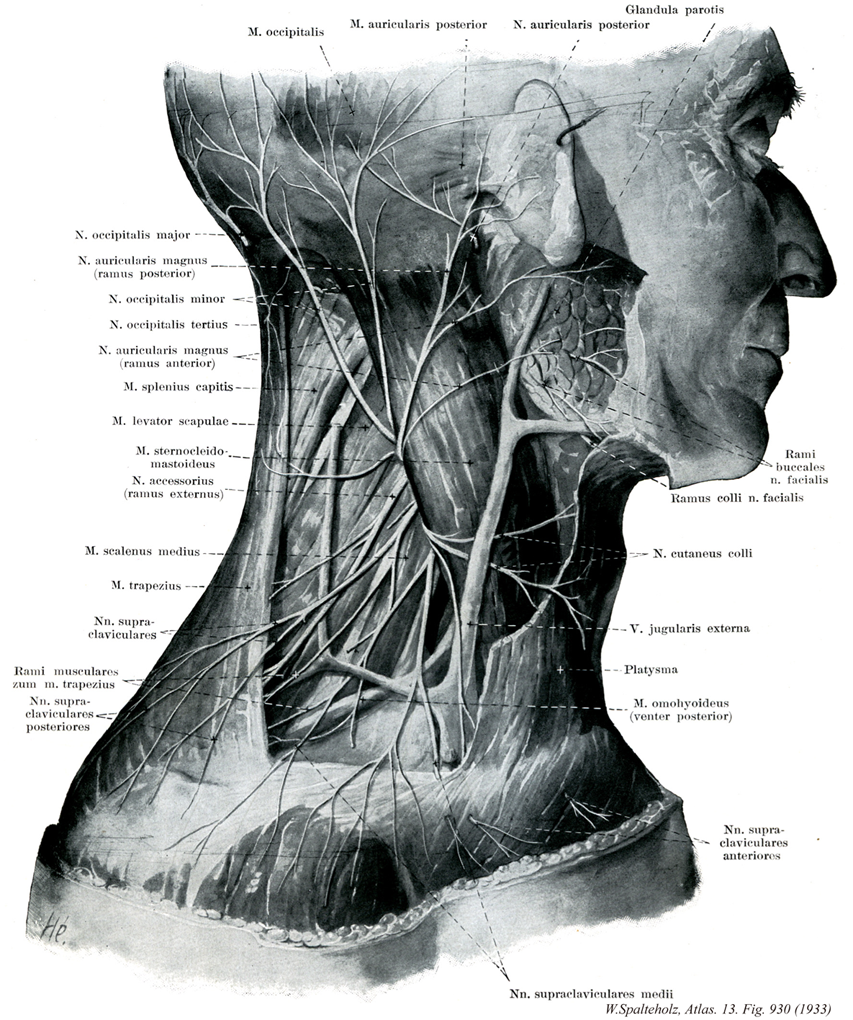 - 930_04【Great auricular nerve大耳介神経 Nervus auricularis magnus】 Nerve ascending vertically near the middle line of the sternocleidomastoid to the ear.
