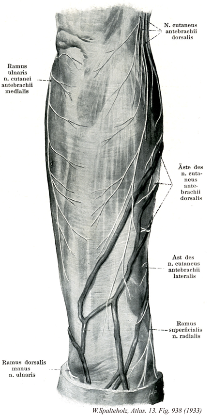 - 938_01【Posterior branch of medial cutaneous nerve of forearm; Ulnar branch of medial antebrachial cutaneous nerve後枝;尺側枝(内側前腕皮神経の) Ramus posterior; Ramus ulnaris (Nervus cutaneus antebrachii medialis)】 Posterior branch of the medial cutaneous nerve of forearm. It supplies the upper two-thirds of the posterior side of forearm.