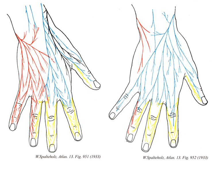 952_01【Lateral cutaneous nerve of forearm; Lateral antebrachial cutaneous nerve外側前腕皮神経;前腕の外側皮神経;橈側前腕皮神経 Nervus cutaneus antebrachii lateralis; Nervus cutaneus antebrachii radialis】 Terminal branch of the musculocutaneous nerve that pierces the brachial fascia at the elbow and supplies the skin of the lateral forearm. →(第5頚神経~第7頚神経由来の筋皮神経の知覚線維は肘窩で筋膜を貫き表面へ出て外側前腕皮神経となり、前腕外側部の皮膚に分布している。 (Netter)外側前腕皮神経は、橈側皮静脈の深部を通り、間もなく前枝と後枝に分岐する。前枝は、前腕橈側の前面を下行し、手首に至り母指球底部に終わる。手首では、外側前腕皮神経は橈骨動脈の前に位置し、前腕筋膜を貫き、この部位の橈骨動脈に終わる小枝を出す。前枝の終末小枝は、正中神経の終末枝の1つである掌枝と交通する。外側前腕皮神経のの後枝は前枝より小さい。前腕の橈側縁を回って後、数本の枝に分かれる。これらの分枝は、前腕背側を覆う皮膚や筋膜の各々の部を支配する。これらの分枝もまた、橈骨神経由来の後前腕皮神経および浅枝と交通する(図6)。外側前腕皮神経により支配される皮膚と付属器(感覚受容器、毛、立毛筋、腺、血管)の領域を右下図に示す。しかし、前腕の橈骨神経の例のように、これら皮膚を支配する終末枝の支配領域には、相当な個体差が認められる。)