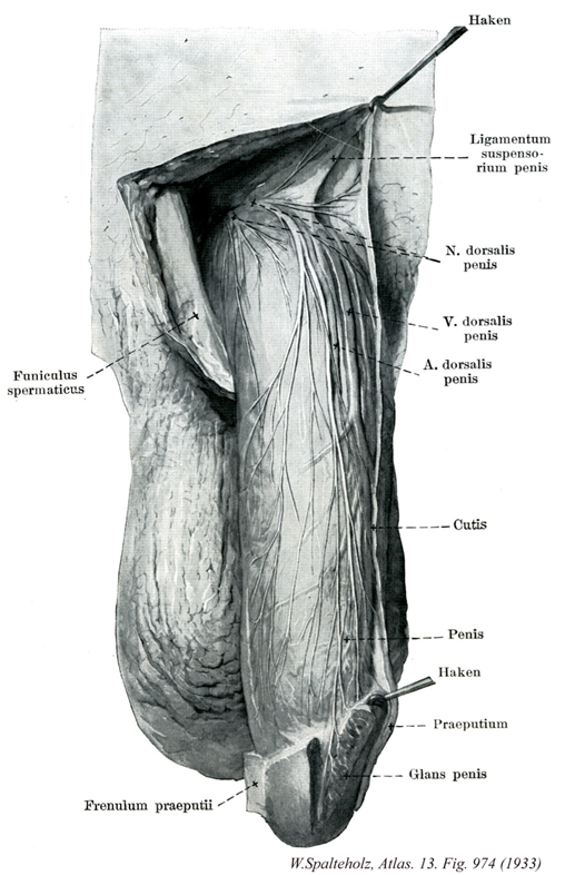 →(陰茎は男性の交接器であるが、泌尿器の一部である尿道をも含む。恥骨に付着する基部が陰茎根で、根より前方の自由部が陰茎体、先端の膨大部が陰茎亀頭、咽頭後縁の高まりを亀頭冠、その後方の溝の部分を亀頭頚という。陰茎上面を陰茎背といい、平たく、下面は尿道が通過する側で、尿道面という。陰茎の主体は、尿道を包む尿道海綿体と、二つの陰茎海綿体である。左右の陰茎海綿体が接着してできる下面の溝に尿道海綿体がはまる。陰茎海綿体の恥骨下枝への付着部を陰茎脚、尿道海綿体の基部のふくらみを尿道球という。亀頭は尿道海綿体が先端でふくらんだものである。各海綿体は結合組織性の強靭な陰茎・尿道海綿体小柱とよばれる平滑筋を含む柱が多数内腔を走る。陰茎海綿体洞には、深陰茎動脈などからの枝であるラセン動脈が直接に流入する。血液が急速に流入すれば、海綿体、海綿体静脈からの血流の還流が妨げられ、海綿体は腫脹して陰茎が膨起する。左右の陰茎海綿体の間の不完全な仕切りを陰茎中隔といい、亀頭内の正中にあるものを亀頭中隔という。三つの海綿体を深陰茎筋膜が共通に包み、さらにその外側を浅陰茎筋膜が包む。陰茎の皮膚はゆるく、前方では二重となってヒダをつくり、これを包皮という。包皮と亀頭下面を結ぶヒダを包皮小帯という。下面には陰嚢縫線につづく陰茎縫線が認められる。亀頭冠には包皮線があり、これは独立皮脂腺である。)
