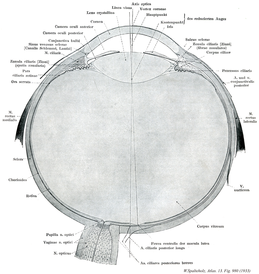 →(眼球は名前のように球状(直径約25mm・体積約8cm3)で、視覚器の主要部をなす。眼窩脂肪体、眼筋筋膜、眼球鞘などに包まれて眼窩中にあり、前方からは眼瞼により保護されている。また眼筋の働きにより球関節に似た自由度の高い体軸性運動を行う。眼球の内部には前方に眼房水、後方に硝子体が満ちて、12~22mmHgの内圧が保たれる。眼球の形状を規定するため、前極、後極、赤道、経線、外眼球軸(前・後極を結ぶ)、内眼球軸、視軸などを用いる。眼球軸は角膜と水晶体前・後面の曲率中心を通る軸で、網膜面では中心窩と円板の中間を通る。したがって水晶体後面の屈曲率中心と中心窩を結ぶ視軸とは一致しない。眼球壁は組織発生的に、①眼球線維膜(強膜、角膜)、②眼球血管膜(脈絡膜、毛様体筋、虹彩支質、角膜内皮、胎児期の瞳孔膜)、③眼球内膜(網膜視部、毛様体・虹彩色素上皮層)の3層よりなる。①と②は中胚葉、③は神経外胚葉に由来する。内部の水晶体は体表外胚葉、硝子体は中胚葉由来であり、眼瞼・眼球膜、角膜上皮は皮膚の表皮の続きである。)