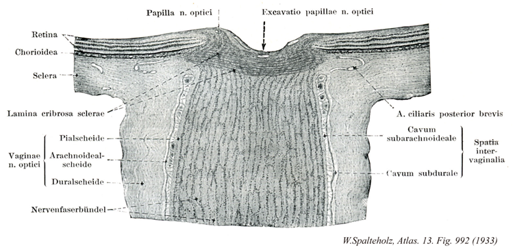 - 992_12【Subarachnoid space of optic nerve; Leptomeningeal space of optic nerve鞘間隙;クモ膜下腔鞘間隙;軟膜腔(視神経の) Spatium intervaginale subarachnoidale nervus optici; Spatium leptomeningeum nervus optici】 Subarachnoid space around the optic nerve and the capillary layer between arachnoid and dura mater.