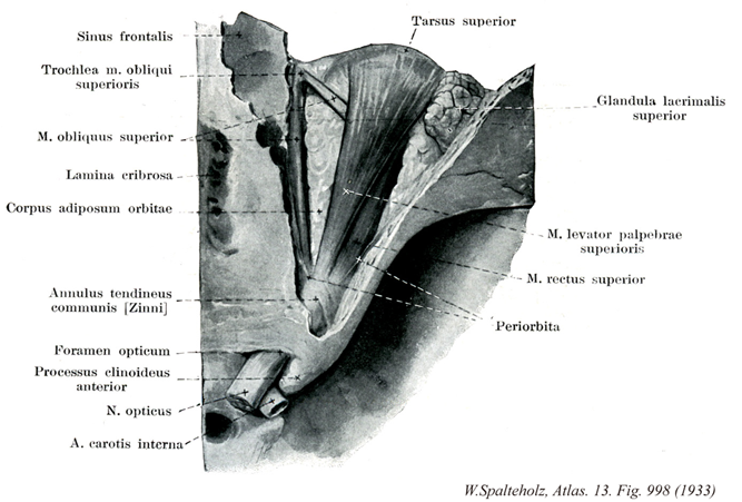 - 998_13【Levator palpebrae superioris muscle上眼瞼挙筋 Musculus levator palpebrae superioris】 o: Upper portion of optic canal and dural sheath of optic nerve. Its insertion tendon widens anteriorly and divides into a superior and an inferior layer. I: Oculomotor nerve.