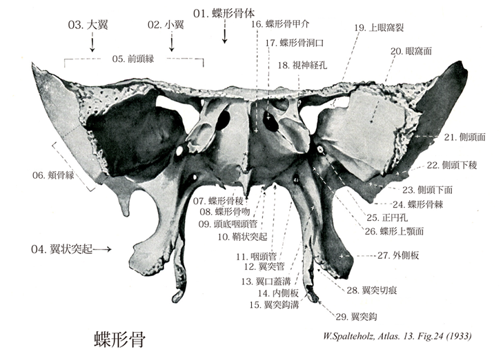 →(蝶形骨は頭蓋底のほぼ中央部にあり、上面観は羽を広げた蝶のように、また前方から見るとコウモリのように見える最も不規則な形をした無対性骨である。蝶形骨は発生学的には四つの部分、すなわち体、大翼、小翼および翼状突起に4部に分けられる。これはらは生後1年以内に癒合して単一の骨となる。蝶形骨は9種の周囲の骨と相接しており、それらは後頭骨、側頭骨、頭頂骨、前頭骨、篩骨、鋤骨、上顎骨、口蓋骨、頬骨である。Sphenoidaleはクサビ(sphen)に似た(eidos)という意味で、蝶とは無関係。これは多くの骨の間にクサビのようにはまりこんだ骨だからである。日本名も以前は楔状骨であり、更に古くは胡蝶骨と呼ばれたこともある。楔状骨の名は現在では足根骨の一つに占有されている。)
