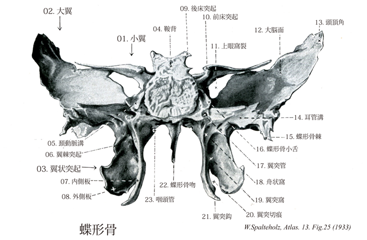 →(蝶形骨は頭蓋底のほぼ中央部にあり、上面観は羽を広げた蝶のように、また前方から見るとコウモリのように見える最も不規則な形をした無対性骨である。蝶形骨は発生学的には四つの部分、すなわち体、大翼、小翼および翼状突起に4部に分けられる。これはらは生後1年以内に癒合して単一の骨となる。蝶形骨は9種の周囲の骨と相接しており、それらは後頭骨、側頭骨、頭頂骨、前頭骨、篩骨、鋤骨、上顎骨、口蓋骨、頬骨である。Sphenoidaleはクサビ(sphen)に似た(eidos)という意味で、蝶とは無関係。これは多くの骨の間にクサビのようにはまりこんだ骨だからである。日本名も以前は楔状骨であり、更に古くは胡蝶骨と呼ばれたこともある。楔状骨の名は現在では足根骨の一つに占有されている。)