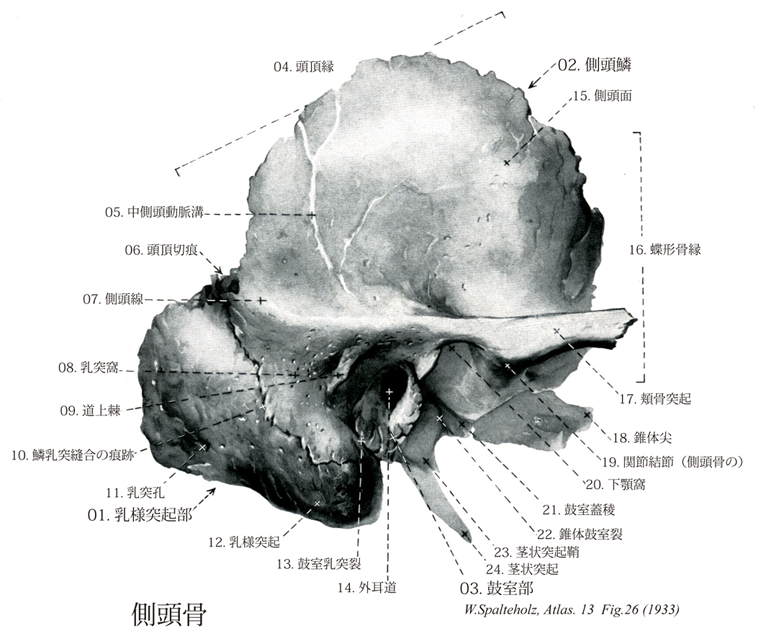→(側頭骨は頭蓋の底部および側面にある大きな不規則形の骨。頭蓋側壁の中央部と頭蓋底中央の両側部を作るばかりでなく、骨の中に平衡聴覚器(外耳道・中耳・内耳)を容れる大切な骨である。岩様部(乳突部と錐体)、鼓室部および鱗部の3部が癒合して単一の骨になるのは生後1年ほど経ってからである。3部が合するところの外面には大きい孔がある。これを外耳孔といい、その内方のつづきは外耳道によって鼓室に通ずる。また、外耳孔の上方で鱗部の外側前方に出る頬骨突起は頬骨に達して頬骨弓をつくる。下縁から咬筋が起こる。)
