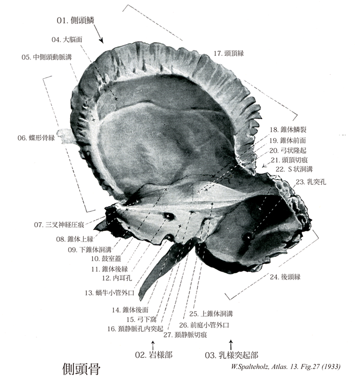→(岩様部は外耳孔の後で下方に突出する乳様突起から頭頂切痕にかけての部を乳突部と、それを底として前内方に水平に突出する四角錐状の骨塊である錐体(狭義の岩様部ということもある)を含めて岩様部(錐体乳突部)と呼ぶ。これは軟骨性頭蓋底の耳嚢に由来する一塊の独立した骨として発生する。しかし、便宜上ここでは乳突部と錐体を分けて説明する。①乳突部の外側面は筋の付着による粗面を有し、外耳孔の後方で下方へ延長した部分を乳様突起といい、胸鎖乳突筋の着くところである。乳様突起の後内側には乳突切痕があり、ここに顎二腹筋後腹が起こり、さらにその内側に後頭動脈溝が認められている。乳突部の内側面には深くて長い陥凹があり、ここにS状洞溝が走り、上方では後頭骨の横洞溝に、下方は頚静脈孔につづく。後縁にある乳突孔は乳突導出静脈を通し、S状洞溝に開く。乳突部の後部は後頭鱗と結合する部分で後頭縁という。顔面神経管は顔面神経の通路で内耳道底の顔面神経野より骨内に入り、蝸牛の外側に沿って、ほとんど水平位で前外方へ進む。次いでほぼ直角をなして後外方へまがり、ここで顔面神経管膝を形成する。その後、鼓室壁の前庭窓の上部すなわち鼓室と骨半規管の間を走行し、外後方に進んだ後、弓状をなして下行し、茎乳突孔に開口する。鼓索神経小管は鼓索神経の通路で茎乳突孔の少し上方で顔面神経管から分かれて前上方へ延び、鼓室溝の後縁に極めて近いところで鼓室に開口する。次いで鼓室の外側壁の粘膜におおわれながら、ツチ骨柄とキヌタ骨長脚との間を前進し、鼓室の前上方を貫通し、錐体鼓室裂を経て、頭蓋外面に出る。②側頭骨の錐体は蝶形骨と後頭骨との間で後外側から前内側に向かい斜位に介在する四角錐体形の骨で、最も堅い骨として知られている。前、後、下の3面および上、前、後の3縁に大別される。先端部を錐体尖といい、蝶形骨体、大翼、および後頭骨底部との間に破裂孔を形成する。破裂孔は骨化せず頭底線維軟骨で満たされており、ここを大・深錐体神経が貫通する。錐体線に頚動脈管の内攻が開口する。すいたの下面に導管の外口が開口し、外口の後上壁から2本の頚鼓小管が入り鼓室に開く。錐体の前縁は蝶形骨大翼との間に蝶錐体裂をなす。前面は大脳面ともよばれ、外側溝半には内耳前半器管によって生じた弓状隆起があり、また弓状隆起と錐体鱗裂との間には鼓室の上壁をなす鼓室蓋がある。錐体戦地角には三叉神経圧痕という小さな窩がある。その後外方に錐体の長軸とほぼ平行に走る2本の溝があり、内側の溝を大錐体神経溝といい、その後端は大錐体神経溝といい、その後端は大錐体神経管裂孔より骨内に入り顔面神経管につづく。また外側の溝は小錐体神経溝といい、その後端は小錐体神経管裂孔より骨内に入り、鼓室を経由して鼓室小管につづく。上縁は前面と後面との境界をなし、境界部の稜に上錐体洞溝がある。後面は小脳面ともよばれ、この面のほぼ中央に内耳孔があり、これは内耳道につづき、さらにつづいて内耳道底となる。内耳孔の上外後方に浅い弓下窩の下外後方に前庭水管の開口である前庭水管外口がある。後縁の前内側部は後頭骨底部に接し、錐体後頭裂をなし、ここに下錐体洞溝がある。その後内側部に頚静脈切痕があり、後頭骨外側部の同名溝と合して頚静脈孔をつくる。この切痕内に出る頚静脈孔内突起はは、後頭骨の同名突起と相対して頚静脈孔を小さい前部と大きい後部とに分ける。下面の前縁鱗部に接するところ、すなわち錐体鱗裂の前内側端に筋耳管管の開口があり、この管は筋耳管管中隔により上部の鼓膜張筋半管と下部の耳管半管に二分されている。また下面の後外側部には大きい弓状の頚静脈窩があり、その直前にある頚動脈管外口との間にはきわめて小さい錐体小窩があり、その底に鼓室小管が開口する。またこの窩の後内方に蝸牛小管の外口が認められる。頚静脈窩の外壁には乳突小管があり、これは骨内で顔面神経管の下端部と交差し、鼓室乳突裂に開く。頚静脈窩の外側で下面の後外側端より細長い茎状突起が出るが、その突起の基部直前に顔面神経管の開口である茎乳突孔がある。この孔の少し上方で鼓索神経小管が顔面神経管から分かれて鼓室の後壁より鼓室の前上隅を貫いて錐体鼓室裂より外頭蓋底出る。なおすいた鼓室裂と既述の錐体鱗裂とを合わせて鼓室鱗裂という。)