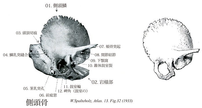 →(側頭骨は頭蓋の底部および側面にある大きな不規則形の骨。頭蓋側壁の中央部と頭蓋底中央の両側部を作るばかりでなく、骨の中に平衡聴覚器(外耳道・中耳・内耳)を容れる大切な骨である。岩様部(乳突部と錐体)、鼓室部および鱗部の3部が癒合して単一の骨になるのは生後1年ほど経ってからである。3部が合するところの外面には大きい孔がある。これを外耳孔といい、その内方のつづきは外耳道によって鼓室に通ずる。また、外耳孔の上方で鱗部の外側前方に出る頬骨突起は頬骨に達して頬骨弓をつくる。下縁から咬筋が起こる。)