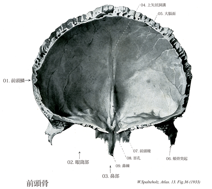 036_00【Frontal bone前頭骨 Os frontale】 →(前頭骨は頭蓋冠の前部を形成する単一の骨であるが、これは左右両半部からの1対2個の骨が正中線上での融合により1個になったものである。ほぼ垂直位を前頭鱗と水平位をなす眼窩部と両側眼窩部間にある鼻部とによりなる。前頭鱗には内面、外面、側頭面の3面がある。外面は前頭面とも呼ばれ前方に向かって膨隆し、最も突出した部分を前頭結節という。その下方にある弓状の隆起を眉弓の間には平坦な部分があり、ここが眼窩部との境界である。眼窩上縁の内側半部には2個の切痕または孔があるが、内側のものを前頭切痕(まれに前頭孔)、外側のものを眼窩上孔(まれに眼窩上切痕)という。眼窩上縁は外下方に突出して頬骨突起となり、頬骨の前頭突起と結合する。また頬骨突起の上縁から側頭線が後上方へ走る。側頭線の後下方の面を側頭面という。内面は大脳面ともよばれ凹面をなし、指圧痕、脳隆起、動脈溝などがある。上部中央には上矢状洞溝があるが、これは頭頂骨の同名溝の延長部である。この溝は前下方にいくにしたがい先細りとなり、下方では前頭稜という隆起に移行する。その最下端部は篩骨の鶏冠との間に盲孔を形成する。盲孔の底は閉塞されている場合が多いが、開口されている場合は鼻腔に通じる導出動脈が通る。前頭鱗の眉間ないし眉弓の内部にある空洞を前頭洞といい、前頭洞中隔により左右両部に分けられている。前頭洞の開口部を前頭洞口といい、これから篩骨漏斗を経て鼻腔の中鼻道に通じている。鱗部の後上部の大部分は頭頂骨に接し、これを頭頂縁という。眼窩部は眼窩上壁をなす部分で、ほぼ三角形であり、両側眼窩部の間には前後に細長い篩骨切痕がある。上面は大脳面で軽い凸面をなし、指圧痕、脳隆起がとくに著明である。下面は眼窩面で凹面をなし、その外側に涙腺窩があり、涙腺を容する。また前内側部には小さな陥凹があり、これを滑車窩といい、ここに滑車棘という小突起をみることがある。前縁は既述の眼窩上縁であり、後縁は蝶形骨縁で鋸歯状をなし、蝶形骨の大翼および小翼と接する。内側縁は篩骨切痕を囲み、篩骨蜂巣に対応する大小の窩を有する。鼻部はおよび上顎骨の前頭突起に接する。鼻骨縁の中央部から下方に突出する小突起を鼻棘という。左右の前頭骨が融合しない正中線上に縫合が残存しているものがあり、これを前頭縫合遺残という。)