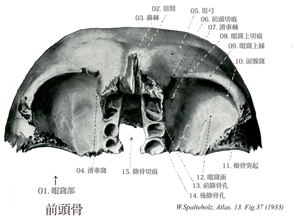 037_00【Frontal bone前頭骨 Os frontale】 →(前頭骨は頭蓋冠の前部を形成する単一の骨であるが、これは左右両半部からの1対2個の骨が正中線上での融合により1個になったものである。ほぼ垂直位を前頭鱗と水平位をなす眼窩部と両側眼窩部間にある鼻部とによりなる。前頭鱗には内面、外面、側頭面の3面がある。外面は前頭面とも呼ばれ前方に向かって膨隆し、最も突出した部分を前頭結節という。その下方にある弓状の隆起を眉弓の間には平坦な部分があり、ここが眼窩部との境界である。眼窩上縁の内側半部には2個の切痕または孔があるが、内側のものを前頭切痕(まれに前頭孔)、外側のものを眼窩上孔(まれに眼窩上切痕)という。眼窩上縁は外下方に突出して頬骨突起となり、頬骨の前頭突起と結合する。また頬骨突起の上縁から側頭線が後上方へ走る。側頭線の後下方の面を側頭面という。内面は大脳面ともよばれ凹面をなし、指圧痕、脳隆起、動脈溝などがある。上部中央には上矢状洞溝があるが、これは頭頂骨の同名溝の延長部である。この溝は前下方にいくにしたがい先細りとなり、下方では前頭稜という隆起に移行する。その最下端部は篩骨の鶏冠との間に盲孔を形成する。盲孔の底は閉塞されている場合が多いが、開口されている場合は鼻腔に通じる導出動脈が通る。前頭鱗の眉間ないし眉弓の内部にある空洞を前頭洞といい、前頭洞中隔により左右両部に分けられている。前頭洞の開口部を前頭洞口といい、これから篩骨漏斗を経て鼻腔の中鼻道に通じている。鱗部の後上部の大部分は頭頂骨に接し、これを頭頂縁という。眼窩部は眼窩上壁をなす部分で、ほぼ三角形であり、両側眼窩部の間には前後に細長い篩骨切痕がある。上面は大脳面で軽い凸面をなし、指圧痕、脳隆起がとくに著明である。下面は眼窩面で凹面をなし、その外側に涙腺窩があり、涙腺を容する。また前内側部には小さな陥凹があり、これを滑車窩といい、ここに滑車棘という小突起をみることがある。前縁は既述の眼窩上縁であり、後縁は蝶形骨縁で鋸歯状をなし、蝶形骨の大翼および小翼と接する。内側縁は篩骨切痕を囲み、篩骨蜂巣に対応する大小の窩を有する。鼻部はおよび上顎骨の前頭突起に接する。鼻骨縁の中央部から下方に突出する小突起を鼻棘という。左右の前頭骨が融合しない正中線上に縫合が残存しているものがあり、これを前頭縫合遺残という。)