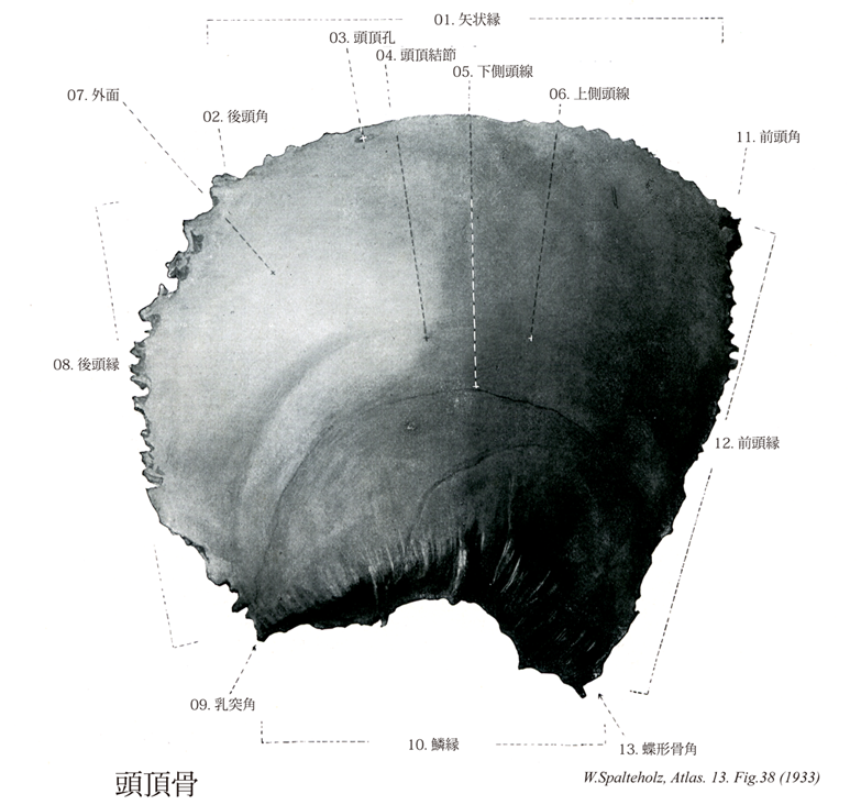 →(頭頂骨は正中線で合して頭頂をつくる1対の頭蓋冠の大部分を形成するほぼ四角形の扁平骨で、4縁、4角、2面を有する。4縁のうち後方で後頭鱗接する部分を後頭縁といい人字縫合をなし、下方で側頭鱗に接する部分を鱗縁といい輪状縫合をなす。4角のうち後上角の後頭角は鈍角、後下角の乳突角は鋭角、前上角の前頭角はほぼ直角、前下角の蝶形骨角は鋭角をなす。外面は頭頂面ともよばれ凸面をなし、中央部でとくに膨隆した部分を頭頂結節という。頭頂結節は胎児および若年頭蓋で著明である。また左右両側の頭頂結節間の距離が頭蓋の幅の最も広いところ、すなわち最大脳頭蓋幅径として知られている。頭頂結節の下方に上下2本の弓状の線が認められるが、上の線を上側頭線といい側頭筋膜の着く所である。下の線を下側頭線といい側頭筋の着くところである。矢状縫合の後方部に頭頂孔という小孔があり、ここを頭頂導出静脈が通る。内面は大脳面ともよばれ凹面をなし、指圧痕、脳隆起、動脈溝などが認められ、骨の上縁に沿って幅の広い矢状溝があり、他側の頭頂骨の同名溝と合して完全な上矢状洞溝となる。この近くには多数の小窩があり、クモ膜顆粒をいれる。また乳突角の部分にはS状洞溝の上部の一部が認められる。)