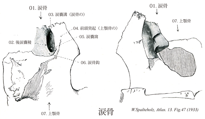 047_01【Lacrimal bone涙骨 Os lacrimale】 Bone located in the orbit in front of the orbital plate of the ethmoid. →(涙骨は左右1対の不正長方形の薄い骨で、上顎骨の前頭突起後方の眼窩の内壁の一部をなす。これに続く鼻涙管の骨壁の一部もつくる。この骨も結合組織性骨化によって生ずる。涙骨の全体の形は手指の爪に似ているが、厚さは爪よりも薄い。下鼻甲介、篩骨、前頭骨、上顎骨と連結する。外面は眼窩に向かい、中央を縦走する稜縁の前方にある溝状のくぼみが涙嚢窩の構成に加わる部分である。外側面は眼窩の内側壁の前部を形成し、内側面は鼻腔(中鼻道)の外側壁の一部を作る。上縁は前頭骨眼窩部と、下縁は上顎骨眼窩面と、前縁は上顎骨前頭突起と、後縁は篩骨眼窩板とそれぞれ接している。外側面の前半部には縦に走る涙骨溝があり、これは上顎骨の前頭突起の同名溝と合して涙嚢窩を形成する。涙嚢孔の後方の境界を後涙嚢稜といい、下方へ延びて涙嚢鈎となり、上顎骨前頭突起の涙嚢溝および下鼻甲介の涙骨突起とともに鼻涙管壁の一部を形成する。Lacrimaleはlacrima(涙)の形容詞である。)