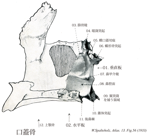 056_01【Perpendicular plate of palatine bone垂直板;鉛直板;上顎板;鉛直部(口蓋骨の) Lamina perpendicularis; Lamina maxillaris; Pars perpendicularis (Os palatinum)】 Vertical bony plate contributing to the walls of the nasal and maxillary sinuses. →(垂直板の内側面は鼻腔外側壁の後部をつくり、前後に走る上下二つの稜があり、上のもの(篩骨稜)には中鼻甲介後端がつき、下のもの(鼻甲介稜)は発達よく、下鼻甲介をつける垂直板の上縁は深く切れ込むが(蝶口蓋切痕)、上方に蝶形骨体があるので孔(翼口蓋孔)となり、鼻腔と翼口蓋窩を連絡する。蝶口蓋切痕の前の突起(眼窩突起)はうしろの突起(蝶形骨突起)より大きく、上前方に向かって5面あり、内側の3面は他骨との接触面で、前は上顎骨、中のは篩骨(この部分は篩骨洞をおおうためへこむ)、うしろのは蝶形骨体につく。外側面に2面あり、ともに自由面で、上の面は眼窩底の一番後ろをつくり、下の面は翼口蓋窩に面する。蝶形骨突起は上内方に向かい、下面は内面で鼻腔外側壁をつくり、上(外)面は翼状突起につき、内方にのびて鋤骨翼に達し、これと静脈のとおる管(咽頭管)をかこむ。垂直板の外側面(上顎面)は上顎骨体内面をおおう部のうしろに、縦の前後の二つの粗面があり、前のは上顎骨内面に、うしろのは蝶形骨翼状突起につく。2面の間には蝶口蓋切痕から下る第3の面があって、上は翼口蓋窩の底をつくり、下方は垂直な溝(大口蓋溝)となり、上顎骨の同名溝と合して大口蓋管をつくり、大口蓋孔で口蓋にひらく。大口蓋神経、下行口蓋動脈が通る。この管から通常2本の小管(小口蓋管)が分かれて、錐体突起の基部をつらぬき、その下面下、内側に小孔(小口蓋孔)でひらく。)