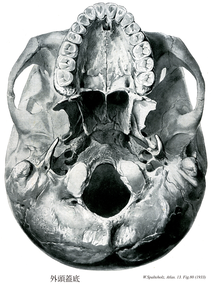 →(外頭蓋底は下顎骨・舌骨を除く頭蓋の下面をいう。その範囲は上顎骨の歯槽弓にはじまり、側頭下稜、頬骨弓の後端、乳様突起の内側、上項線、外後頭隆起に至る境界とする。外頭蓋底は全体とふくれ上がって凹凸に富み不整複雑な面である。)